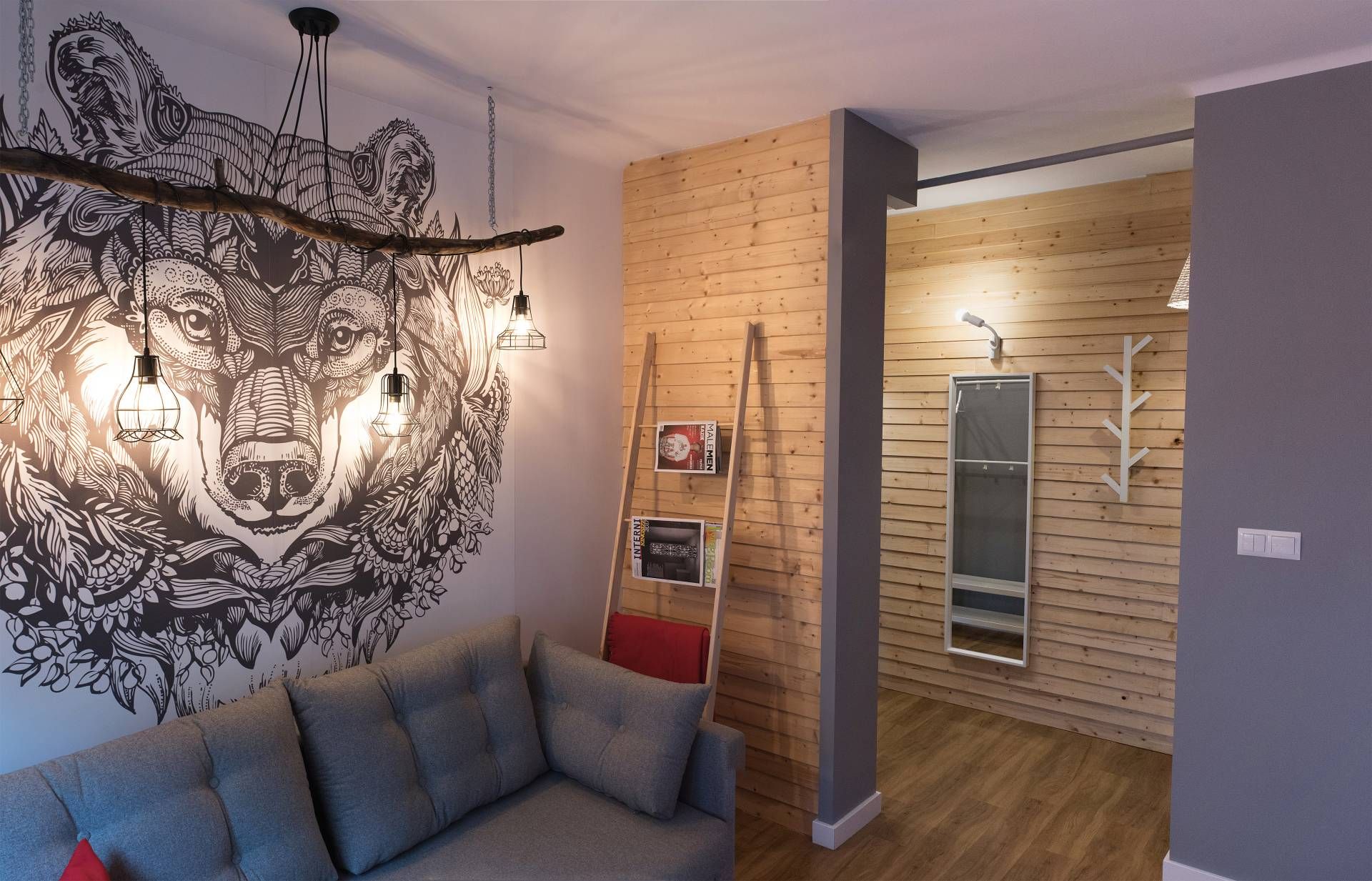 * salon z unikatową grafiką niedźwiedzia i rozkładaną wygodną sofą,