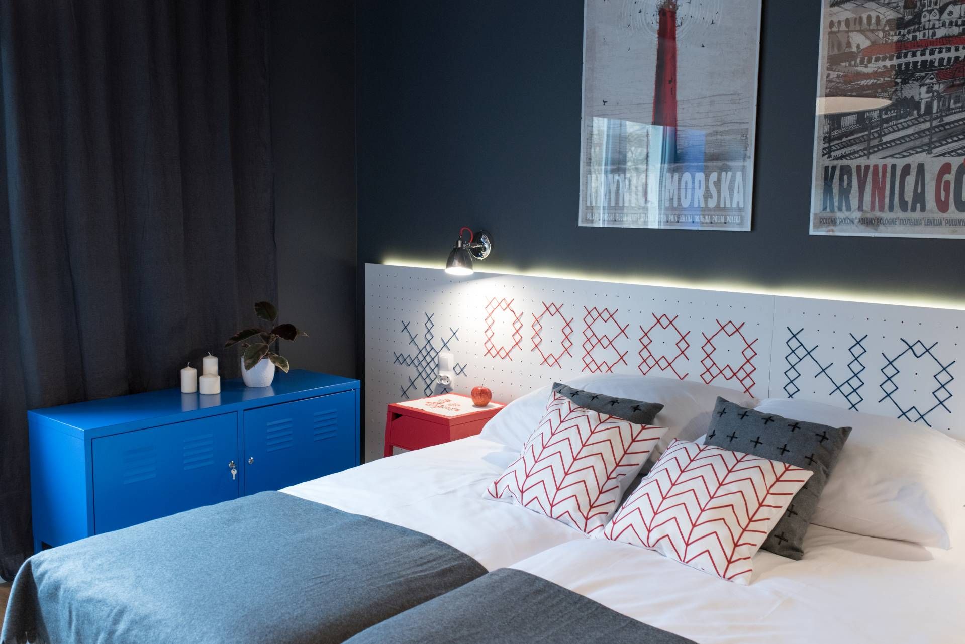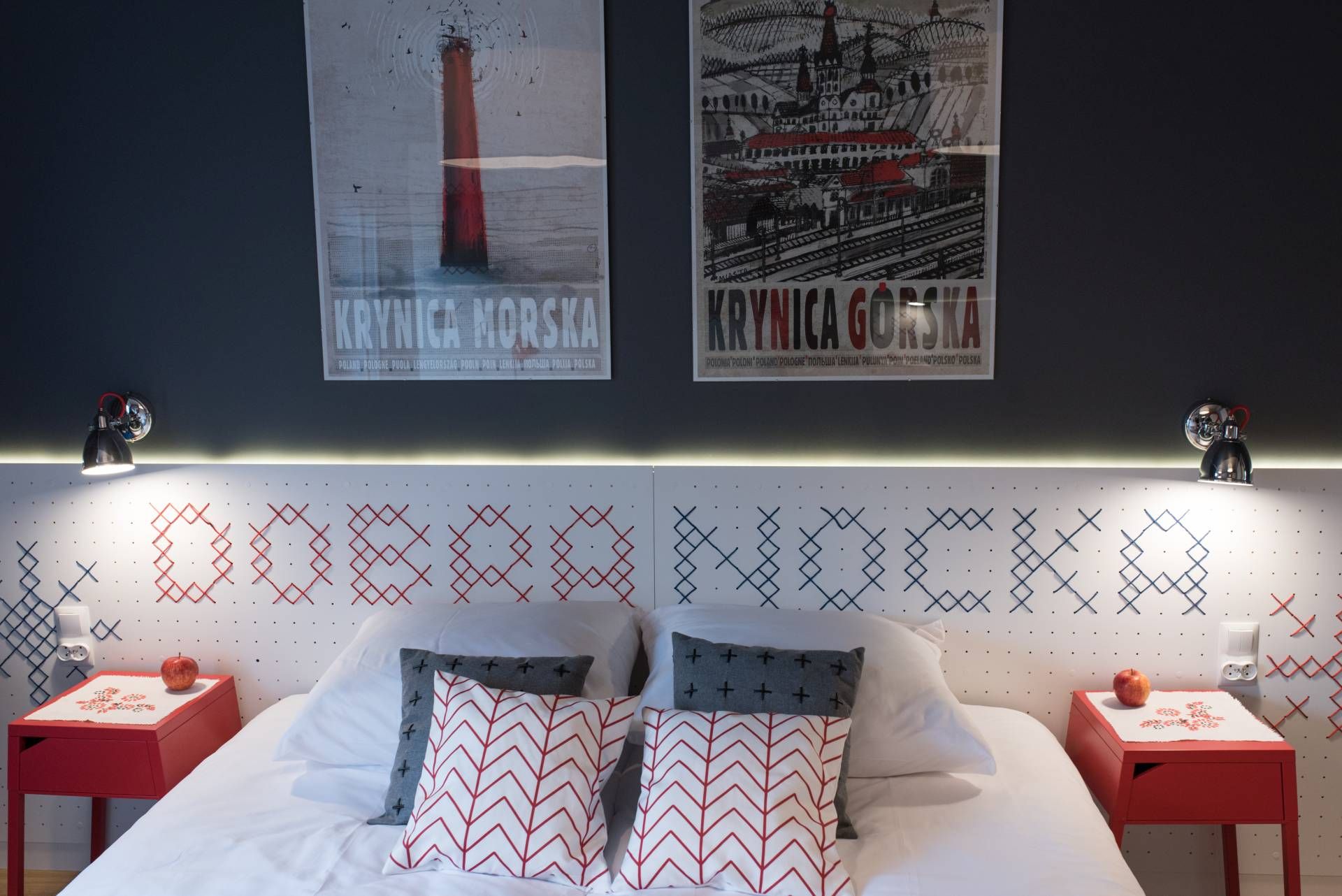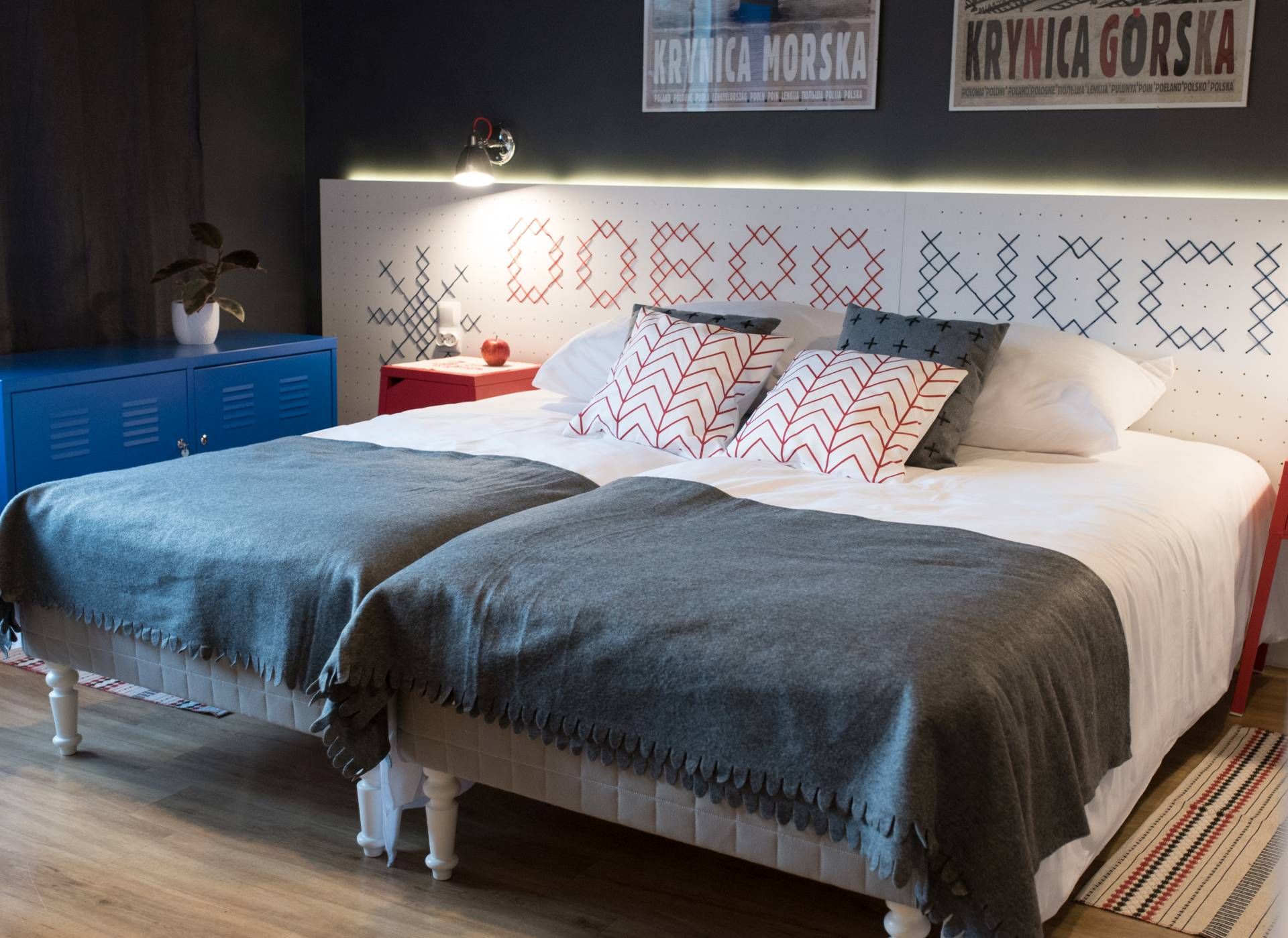 * sypialnia z dwoma pojedynczymi łóżkami, którą ozdobiliśmy elementami haftu łemkowskiego,