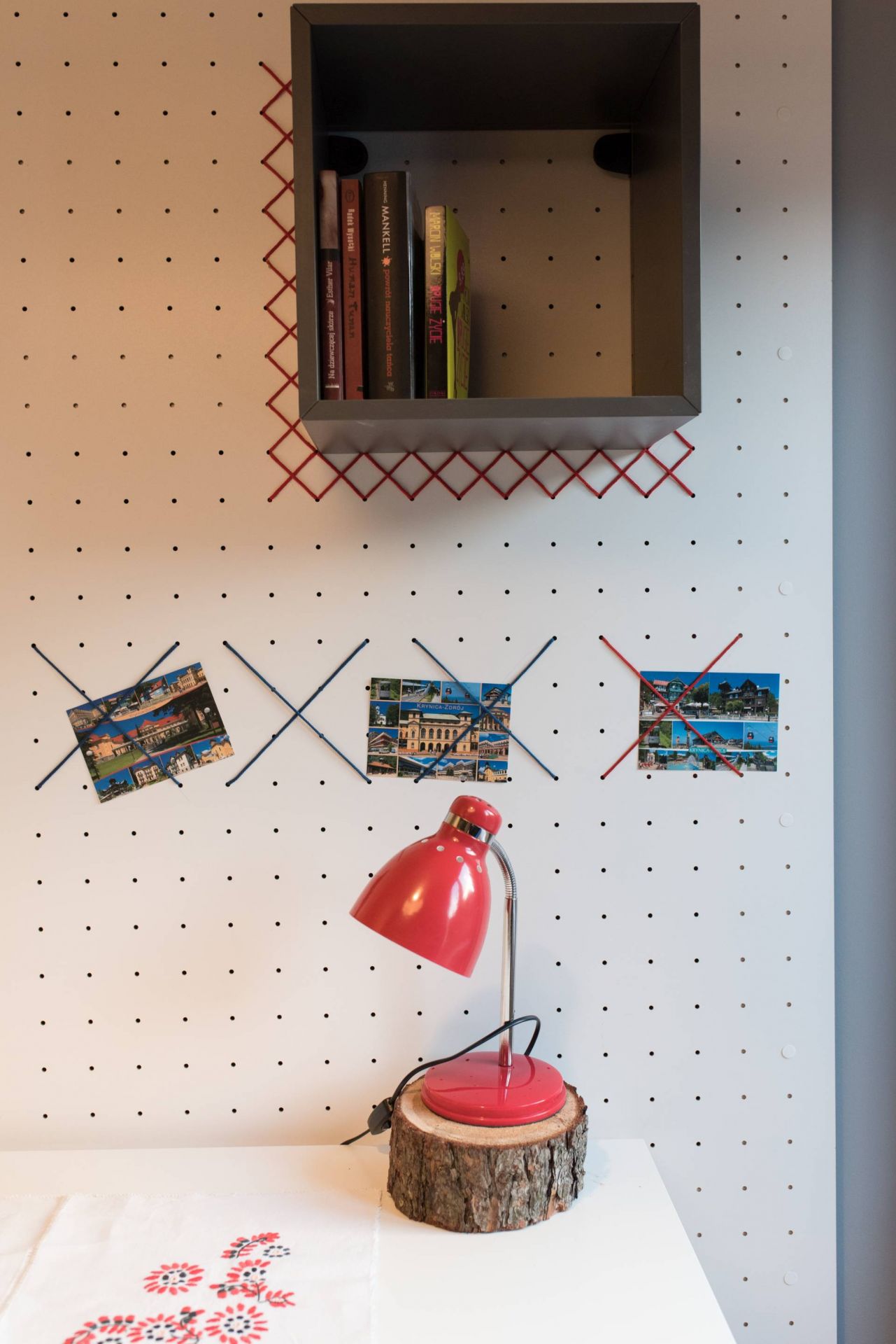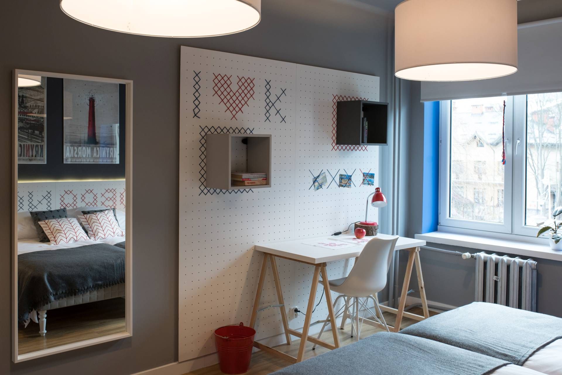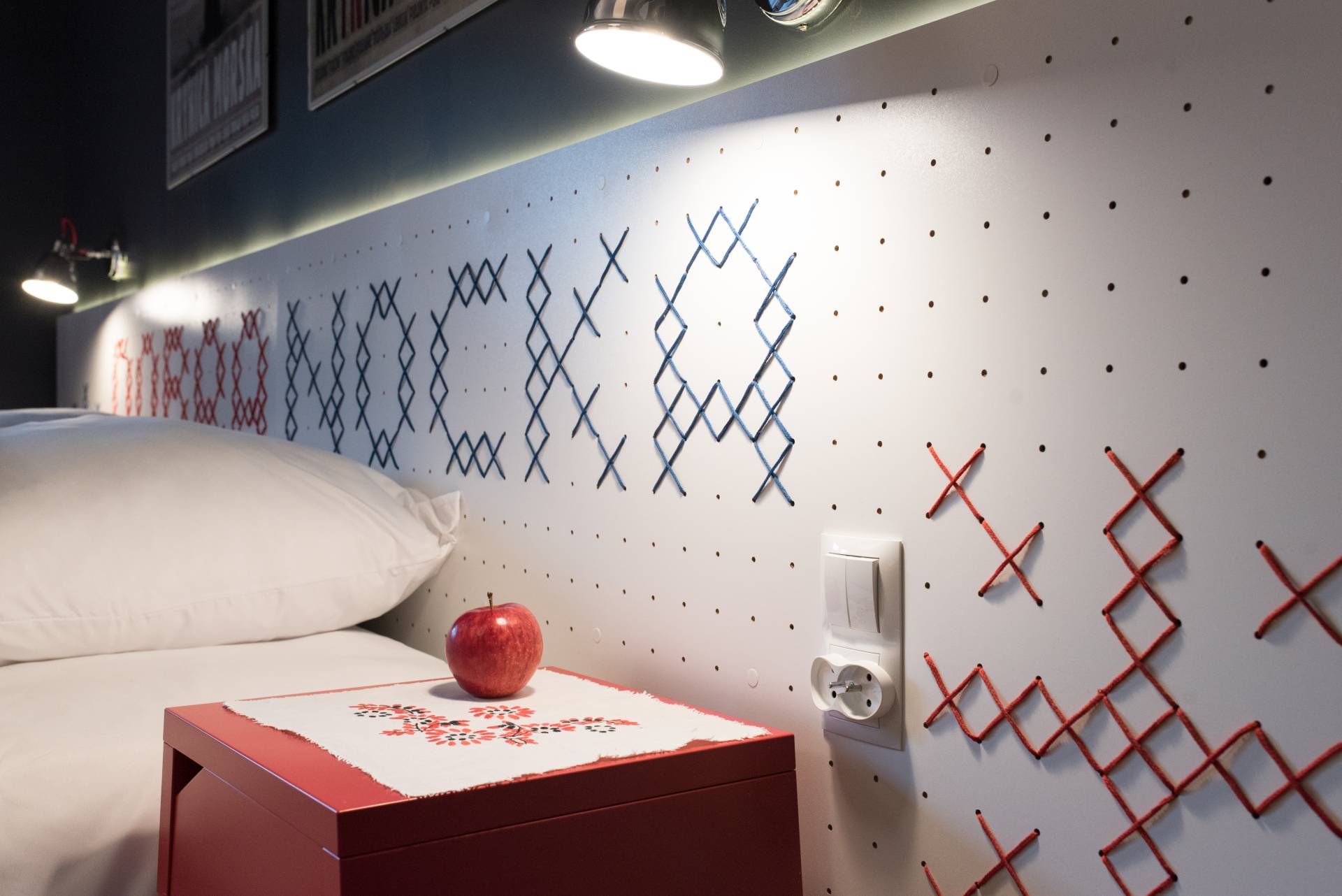 * sypialnia z dwoma pojedynczymi łóżkami, którą ozdobiliśmy elementami haftu łemkowskiego,